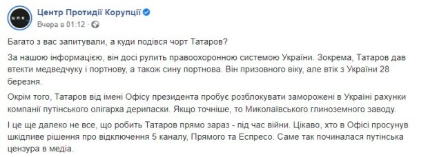 "Окрім того, Татаров від імені Офісу президента пробує розблокувати заморожені в Україні рахунки компанії путінського олігарха дерипаски. Якщо точніше, то Миколаївського глиноземного заводу. І це ще далеко не все, що робить Татаров прямо зараз - під час війни", – йдеться на фейсбук сторінці Центру протидії корупції.