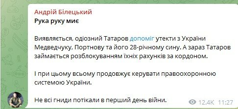 "Рука руку миє. Виявляється, одіозний Татаров допоміг утекти з України Медведчуку, Портнову та його 28-річному сину. А зараз Татаров займається розблокуванням їхніх рахунків за кордоном. І при цьому всьому продовжує керувати правоохоронною системою України. Не всі гниди потікали в перший день війни", – пише Андрій Білецький.