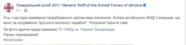 "Ось і наслідки вживання награбованого окупантами алкоголю. Екіпаж російського БМД-3 вирішив, що вони за штурвалом "русского воєнного корабля". Результат бачите самі", – йдеться у публікації.