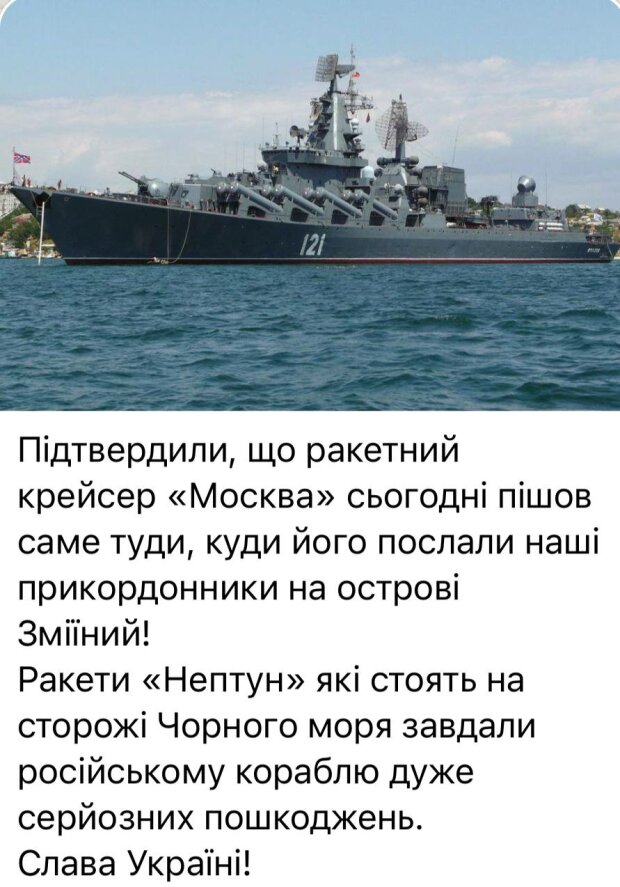 Увечері 13 квітня за неофіційними повідомленнями українські військові завдали два ракетних удари по флагману Чорноморського флоту рашистів крейсеру "Москва".