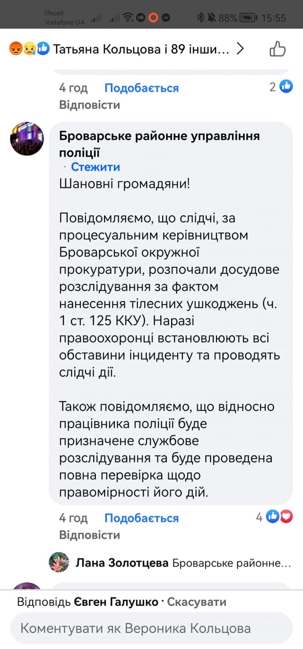 Наразі відомо, що Броварське районне управління поліції пообіцяло провести детальне розслідування обставин справи, але офіційна інформація від правоохоронних органів поки що відсутня.