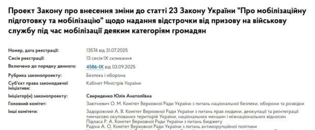 Крім того, Верховна Рада підтримала у першому читанні законопроект про надання відстрочки від мобілізації на 12 місяців чоловікам віком від 18 до 25 років, які служили за контрактом терміном на один рік у період воєнного стану та вже звільненим у запас.