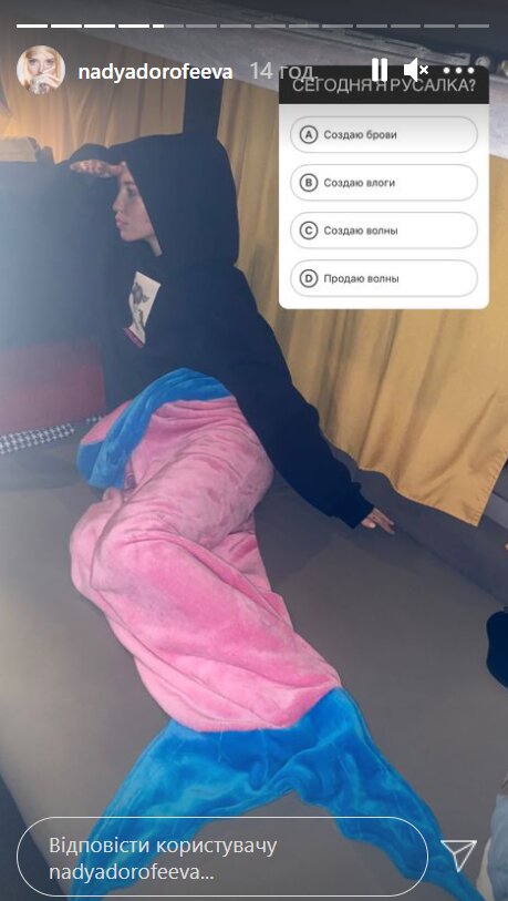 Відповідні фотографії Надя Дорофєєва опублікувала на своїй сторінці в Instagram у розділі сторіс. На фото Надя в толстовці-оверсайз чорного кольору прикрилась рожевою милою ковдрою, що нагадує хвіст русалоньки.