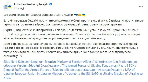 "Еще один транш военной помощи для Украины. Эстония передала Украине противотанковые ракеты, гаубицы, противотанковые мины, безоткатные противотанковые орудия, автоматическое оружие, боеприпасы, одноразовые гранатометы и ручные гранаты. Кроме этого, эстонские предприниматели в сотрудничестве с государственными учреждениями и Вооруженными силами Эстонии передали украинским военным шлемы, бронежилеты, средства связи, дроны, приборы ночного видения, лазерные дальномеры, медицинские товары и одежда химзащиты. Чтобы Украина оставалась свободной, нужно еще больше. Эстония призывает все европейские страны предоставить Украине необходимое вооружение, военную и гуманитарную помощь, политическую поддержку, а также усилить санкции против России и прекратить прямо или косвенно поддерживать экономику РФ", – говорится в публикации посольства.