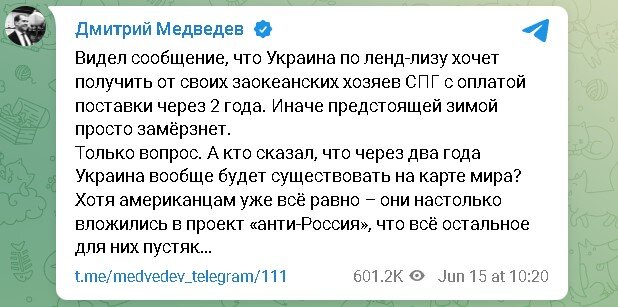 "Видел сообщения, что Украина по ленд-лизу хочет получить от своих заокеанских хозяев СПГ (сжиженный природный газ – ред.) с оплатой поставок через 2 года. Иначе этой зимой просто замерзнет. Только вопрос. А кто сказал, что через два года Украина вообще будет существовать на карте мира? Хотя американцам уже все равно – они настолько вложились в проект "анти-Россия", что остальное для них мелочь", - написал Дмитрий Медведев.