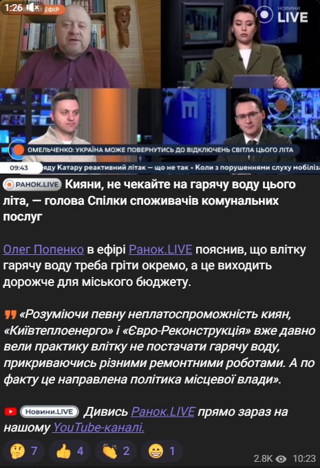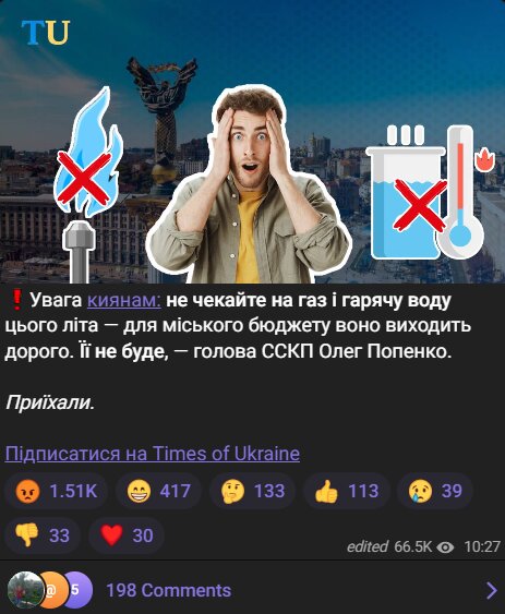 «Внимание киевлянам: не ждите газа и горячей воды этим летом — для городского бюджета оно выходит дорого. Ее не будет, - председатель ССКП Олег Попенко», - говорится в сообщении популярного Telegram-канала Times of Ukraine, на который подписано более 2-х миллионов человек.