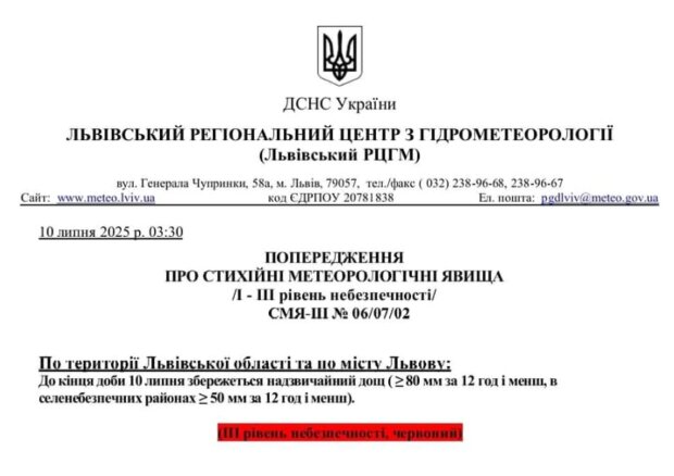 В 3:30 утра Львовский областной центр гидрометеорологии опубликовал официальное сообщение, подтверждающее опасные погодные условия и высокий риск продолжения наводнения в течение дня. В предупреждении говорилось о возможности выпадения более 80 мм осадков в некоторых районах в течение 12 часов.
