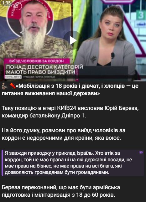 Командир батальона «Днепр-1» Юрий Береза считает, что выживание Украины зависит от распространения мобилизации на всех граждан с 18 лет, независимо от пола.