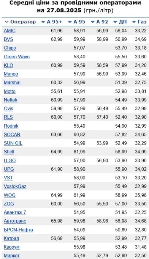 ПодписатьсяДанные консалтинговой группы «А-95» показывают, что по состоянию на 27 августа цены на бензин в крупных АЗС составляют от 53,94 до 61,99 грн за литр. Самыми дорогими остаются премиальные сети, такие как WOG, OKKO и Shell, где цена на топливо составляет 61,99 грн за литр. Самые низкие цены зафиксированы на АЗС «Укр-Петроль» (53,94 грн/л) и «БРСМ-Нафта» (54,09 грн/л).