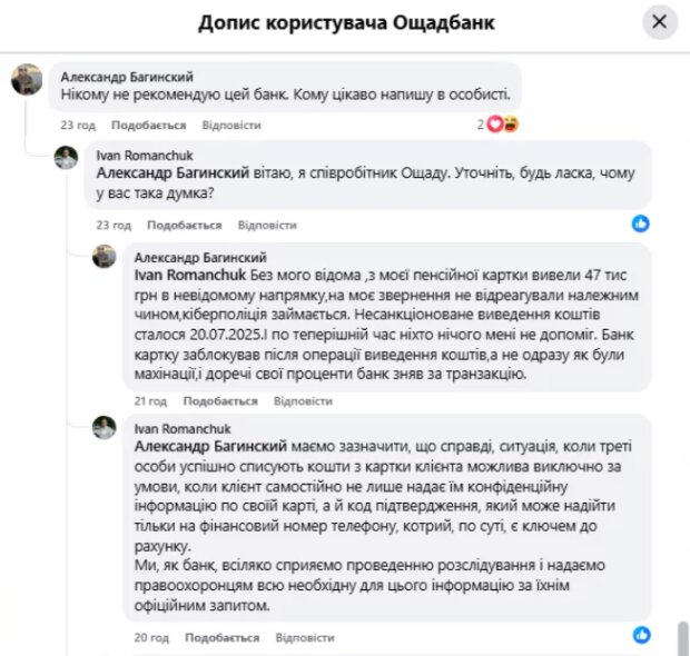 Ощадбанк признает возможность мошеннических транзакций, но подчеркивает, что посторонние лица не могут получить доступ к средствам без участия держателя карты.