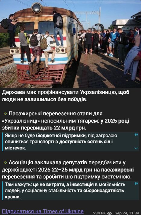 По прогнозам, в 2025 году убытки от пассажирских перевозок «Укрзализныци» составят более 22 млрд грн, что превратит пригородные и междугородние маршруты в тяжёлое финансовое бремя для компании.