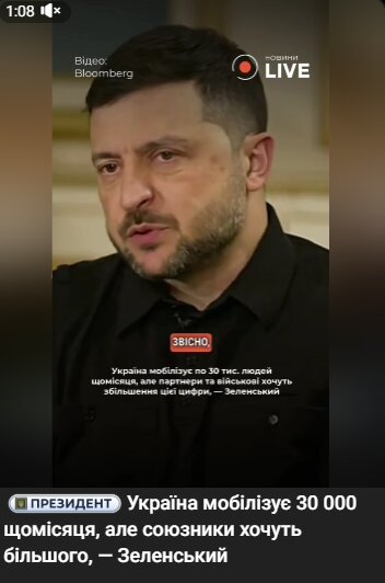 Согласно интервью президента Владимира Зеленского агентству Bloomberg, в настоящее время Украина ежемесячно мобилизует в Вооружённые силы около 30 тысяч человек.