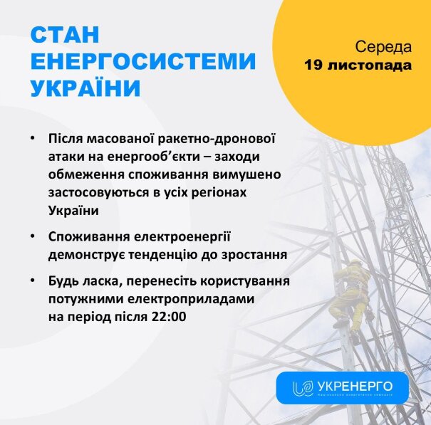 «Из-за последствий последней и предыдущих массированных ракетно-дроновых атак – во всех регионах Украины сегодня применяются меры по ограничению потребления. В областях, где утром применялись аварийные отключения электроэнергии, сейчас действуют графики почасовых отключений. Также в большинстве регионов Украины продолжают действовать графики ограничения мощности для промышленных потребителей», - сообщили в Укрэнерго.
